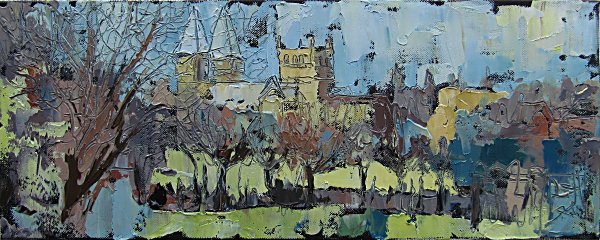 Today I delivered a batch of fresh works to the Bull Yard Gallery in Southwell. They included my new series of Southwell Minster landscape paintings. I’ve done these in a long landscape format. I’ve been working on them at intervals since the autumn, so they show the cathedral from several viewpoints at different seasons.