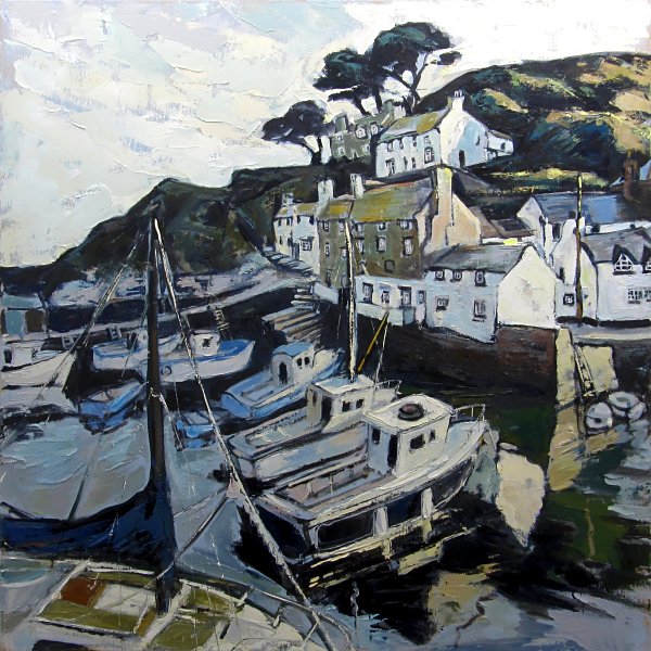 In this painting of Polperro, my focus is particularly on the arrangement of hillside cottages, backlit with a lemony glow of low sun. The harbour is shaded with soft blue and pink, the white of the boats reflecting the ambient light. The becalmed areas of the composition are struck through vertically by the two masts and I used both the sharp fall of the hill in the background and the sweep of the rigging in the foreground, to give the painting its dynamic.