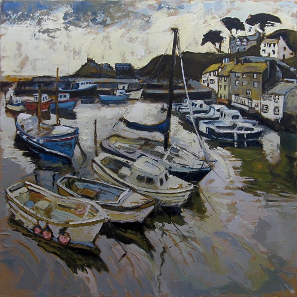 This last O3 Gallery painting is of Polperro Harbour when the light had a silvery glint to it, a point in time when the rain had recently lifted. Although the tonal nature of the painting still suggests a minor key, the sun is waiting in the wings. In the foreground, the overlapping boats set up a gently rocking rhythm of forms. They fan about the harbour so that the eye drifts towards the scatter of cottages and the curious backbone of the reclining stretch of land.