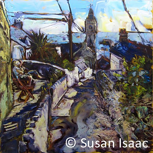 The final Porthleven painting in this series is a view from Institute Hill. The Indian Yellow sun bounces and rebounds off natural stone and whitewash alike. The shadows of the lane take on the warm hues of the sky. Sunlight melts on the bronze skin of the two seated women, who are waiting for a third to join them. Telephone wires, like rigging on a ship, hold the Institute building at the centre of the composition.