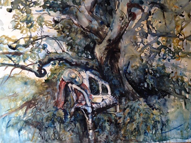 Yesterday, having planned an afternoon of plein air painting on this hottest of days, I found a heavily shaded spot under one of my favourite Bramley apple trees. Working in watercolour on a 22″ x 30″ sheet of Saunders Waterford, I attempted to capture the dappling light before it disappeared.