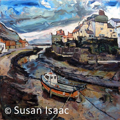 I enjoyed playing with the complimenting colours of blues and oranges in this composition. The foreground boat, held in suspension by its web of moorings, set the key hue of orange, tints of which are echoed in the silted estuary, as well as being scattered amongst the cottage roofs. Intermingling with the salmon red mud was the reflection of soft blues from a billowing sky. The deep tones of the overlying seaweed marked the way of the receding tide.