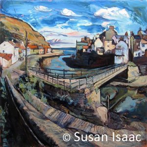 This Staithes painting revolves around the footbridge over the Beck and in particular, the upright form of its nearside buttress. A bright and briskly sunny day enhanced the shadows and highlighted the roughly textured courses of masonry and cobbles. This swathe of stonework, along with the foreground retaining wall, directs the gaze forward into the scene, after which the eye can choose to travel on towards the end of the harbour, or turn to cross the bridge itself and into the jostle of cottages.