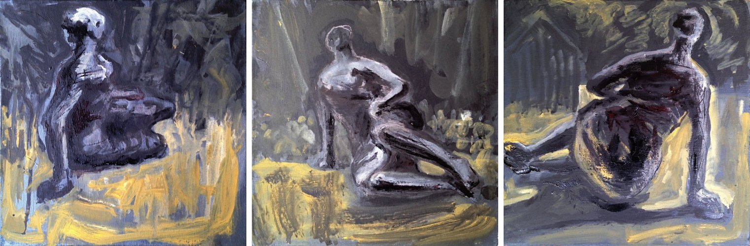 I chose three stations and revolved around the statue, building my three triptych images by turns. The tonal nature of the bronze worked well for the limited palette I had chosen to work with, concentrating on the mass of the form through tonal mark making. The deadline for submitting work was 11am and the heat of the day built along with my studies. At literally the eleventh hour I gathered up my three paintings on a sheet of cardboard (abandoning my materials) and headed back to the event marquee, passing James herding the artist stragglers with his van.