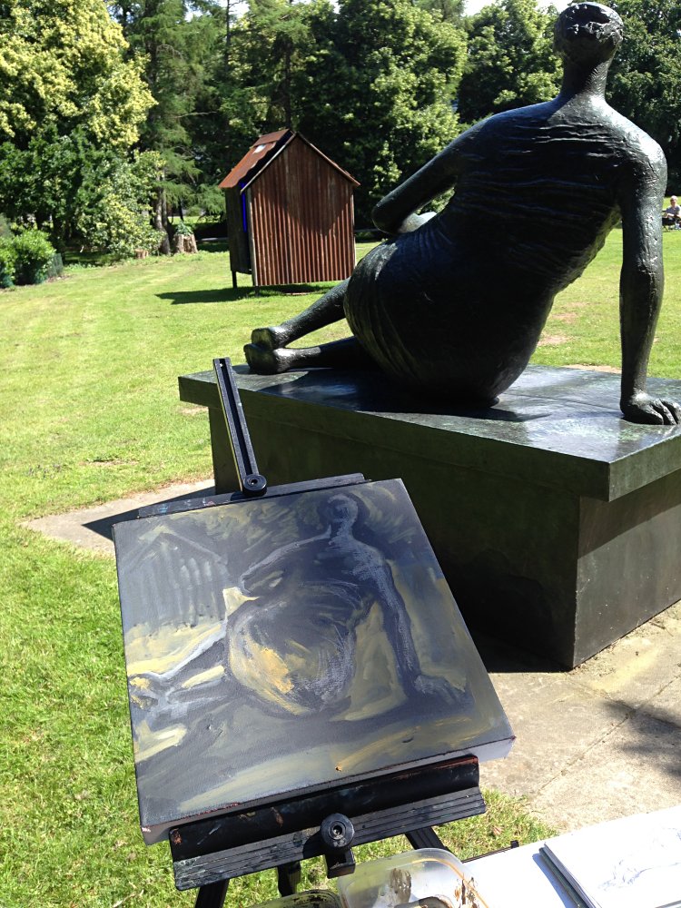 The last day was at the Sainsbury Centre for Visual Art on the UEA campus starting at 8am. The sun was out, the grass was a zesty lemon, the shadows were made of deepest purple and the grounds were full of sculptures. I was immediately caught by a Henry Moore figure, ‘Draped Reclining Woman‘, just next to the Centre’s café and I came up with an idea to describe the figure from a series of viewpoints.