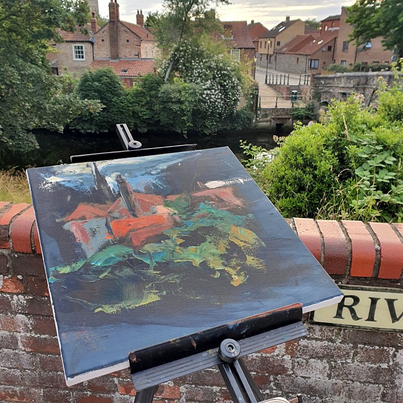 My first painting for Paint Out Norfolk 2019 was completed at the opening session in Norwich on Monday evening – looking across the River Wensum beside Bishop Bridge towards the spire of Norwich Cathedral (with the Red Lion pub close by on Bishopgate).