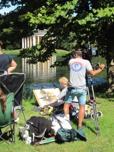 And then we were off – in my mind to the tune of ‘Wild Thing’ (as rendered by the Goodies) – following the production manager at a gathering pace, deckchairs etc flapping. With cameras rolling we swung right, over a bridge and onto a broad stretch of turf, approaching the fine neoclassical frontage of West Wycombe House … but with heads craning longingly towards the house, we were ushered on for a final furlong, and called to halt in a clearing at the end of a small ornamental lake.