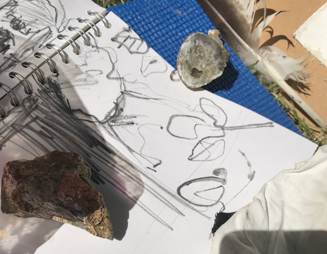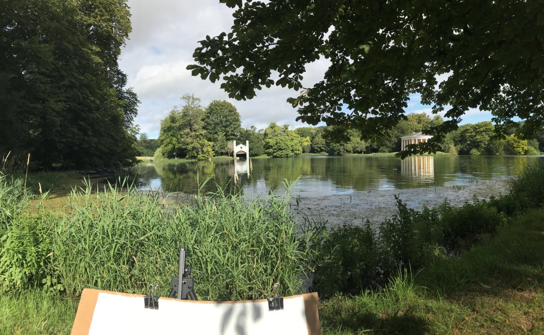 We were bidden to settle ourselves down and to begin painting. People quickly threw down their kit bags and dug themselves a defendable space. I felt panicked by the overwhelming amount of pretty greenery and couldn’t sight on anything of immediate interest. I could see a tantalizingly meaty Grecian Temple off to one side on an island in the lake, which had clearly been reserved for the top table of Pod dwellers. Peering at the water ahead of our group I found the other more modest focal point, in the shape of a Gothic wooden boat house. I resolved to render this structure with as much regard as I would any classical confection. I plunged to the ground in front of some ensconced deckchair dwellers and – making myself as low as possible – set out my picnic of recycled plastic paint pots and paper-plate palettes. Feeling more comforted by my encircling installation, I began to relax. Then I remembered my Red Kite feather and flint nodules and added them, like talismans, to the assemblage. As I began to map out a composition, I considered how they might be able to play their part in informing the landscape in front of me.