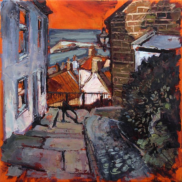 ‘Staithes Harbour from Mount Pleasant’ (2023) Oil on canvas, 30x30cm Ref 1125 – Sold Contact: Staithes Gallery
