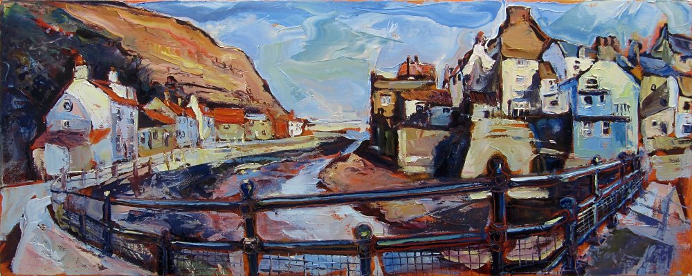 ‘Staithes Beck from the Footbridge’ (2014) Oil on canvas, 30x76cm Ref 677 – SOLD (Staithes Gallery)