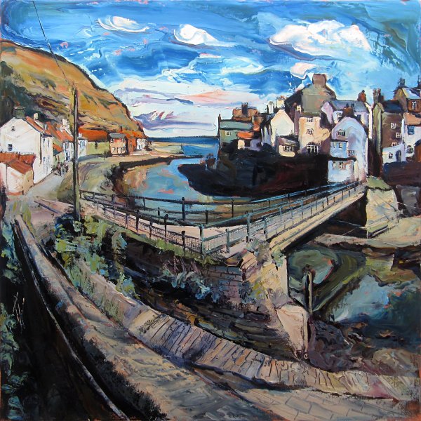 ‘Staithes Beck and Footbridge’ (2017) Oil on canvas, 76x76cm Ref 837 – SOLD (Staithes Gallery)
