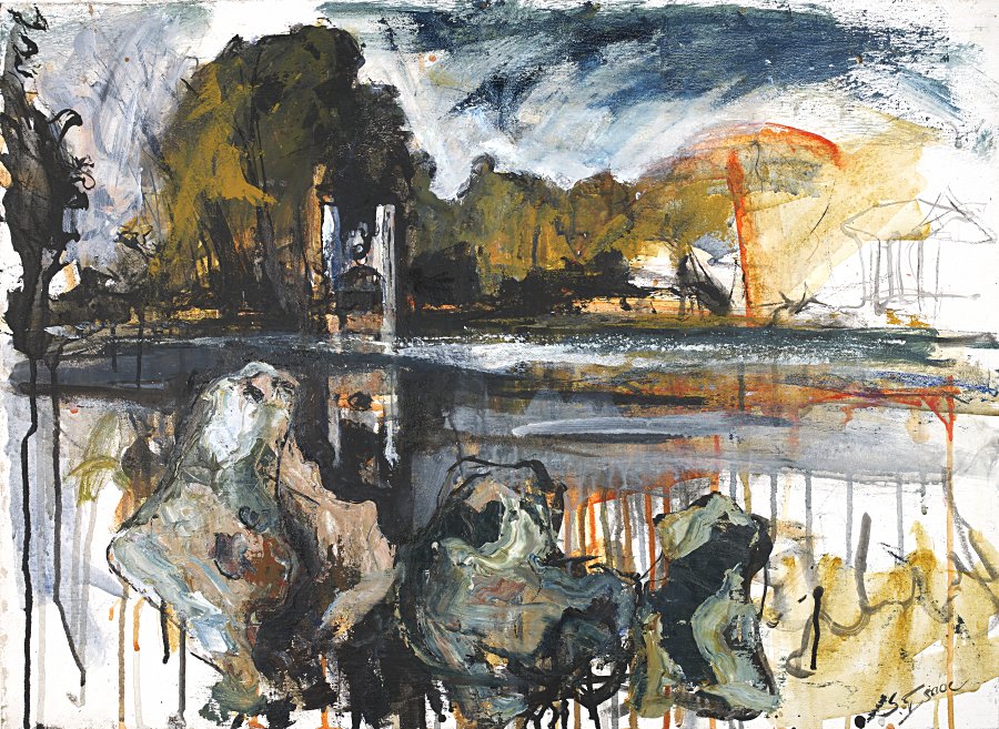 The view is looking across the ornamental lake to the Gothic boathouse. I made use of some beautiful flint nodules, standing them on end like megaliths in the foreground – reflecting on how they formed the land many years before landscape architects appeared on the scene.